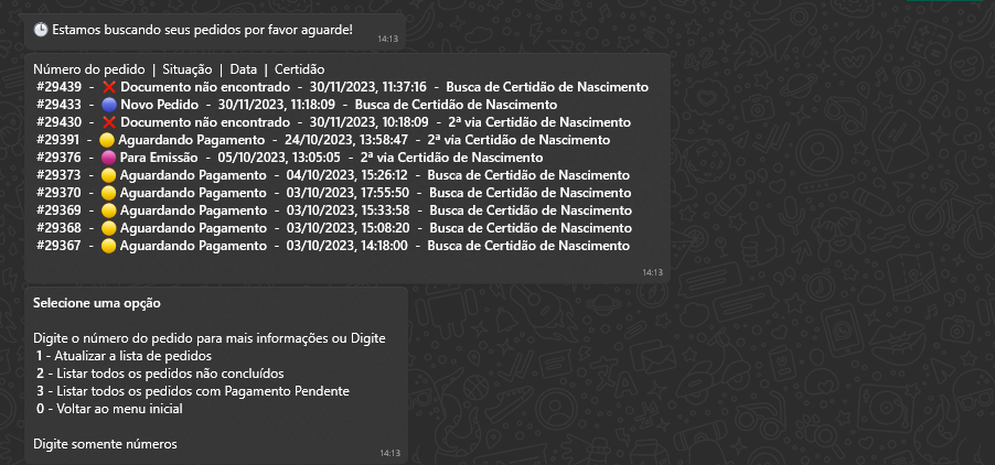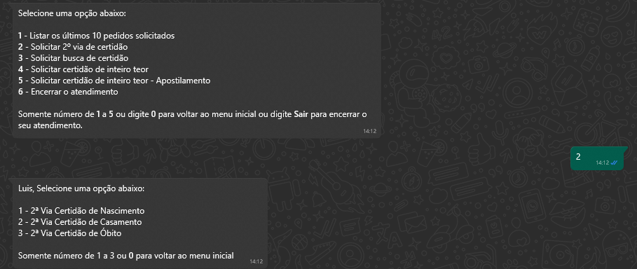 1. Chatbots: É possível criar um chatbot personalizado para interagir com os clientes no WhatsApp. O chatbot pode ser programado para responder a perguntas comuns, fornecer informações sobre produtos ou serviços, coletar dados dos clientes e realizar tarefas básicas de atendimento, Exemplo: atendimento para cartórios pelo whatsapp para criação de pedidos ou listar pedidos.